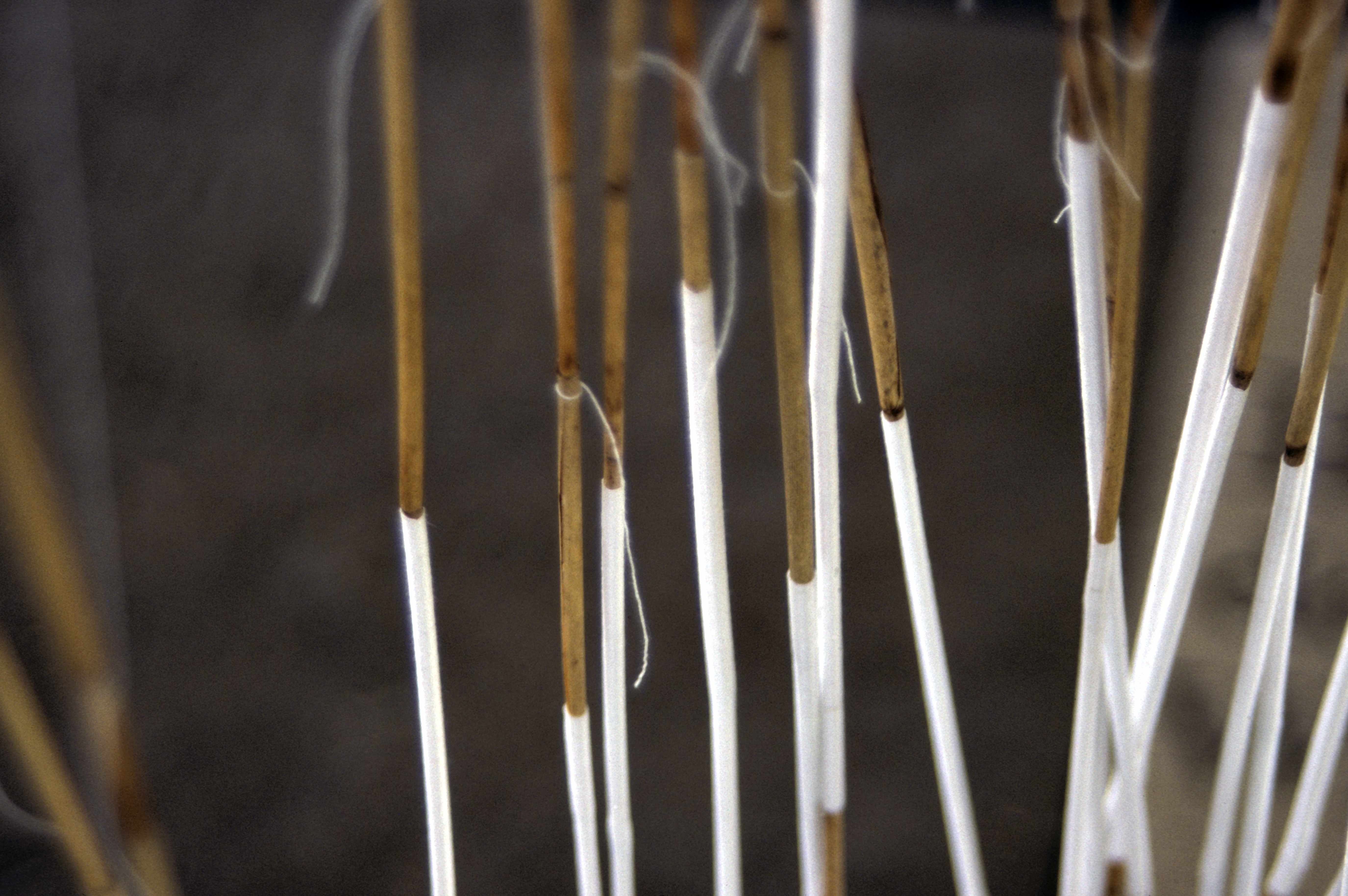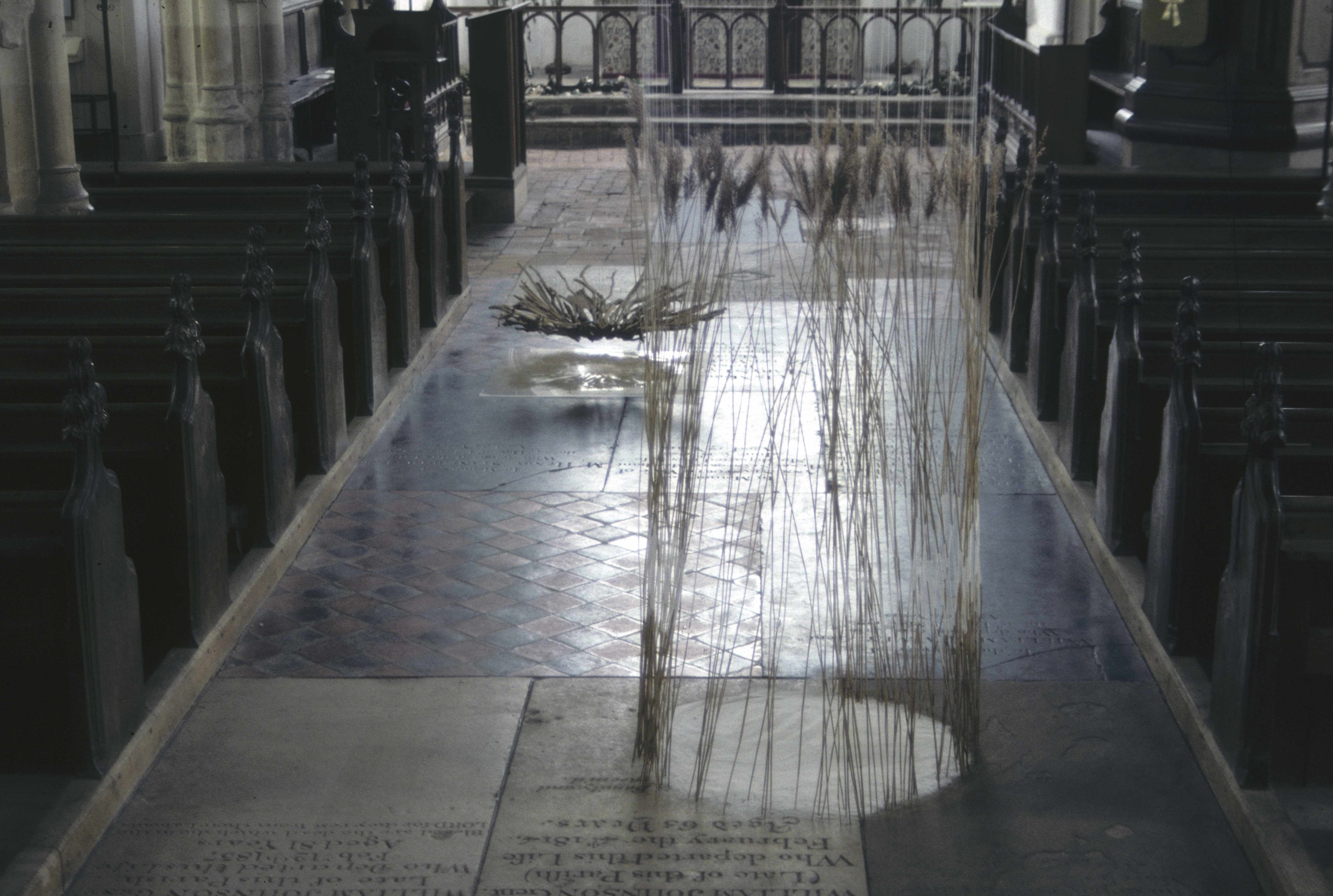 I made two installations for this exhibition. The first, entitled Merum Sal, was a circular space defined by salt and by reeds, each bound with fine cotton and suspended from the tie bars in the roof of the nave. The second, Reliquary, was a shallow dish made of driftwood and suspended by paper string from the tie bar in the roof of the church 10 metres above. The sawdust from the construction process was sprinkled through the gaps in the driftwood onto a square of plexiglass on the floor, leaving a ghostly impression of the dish.