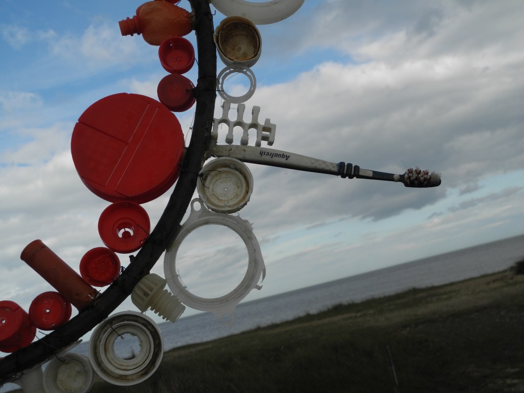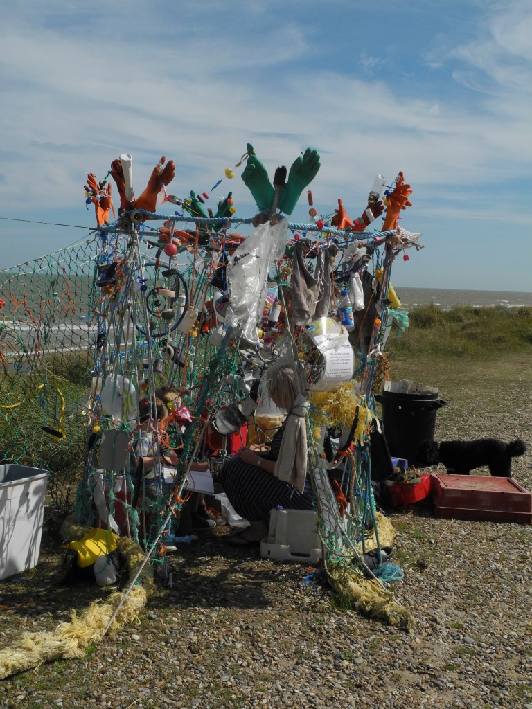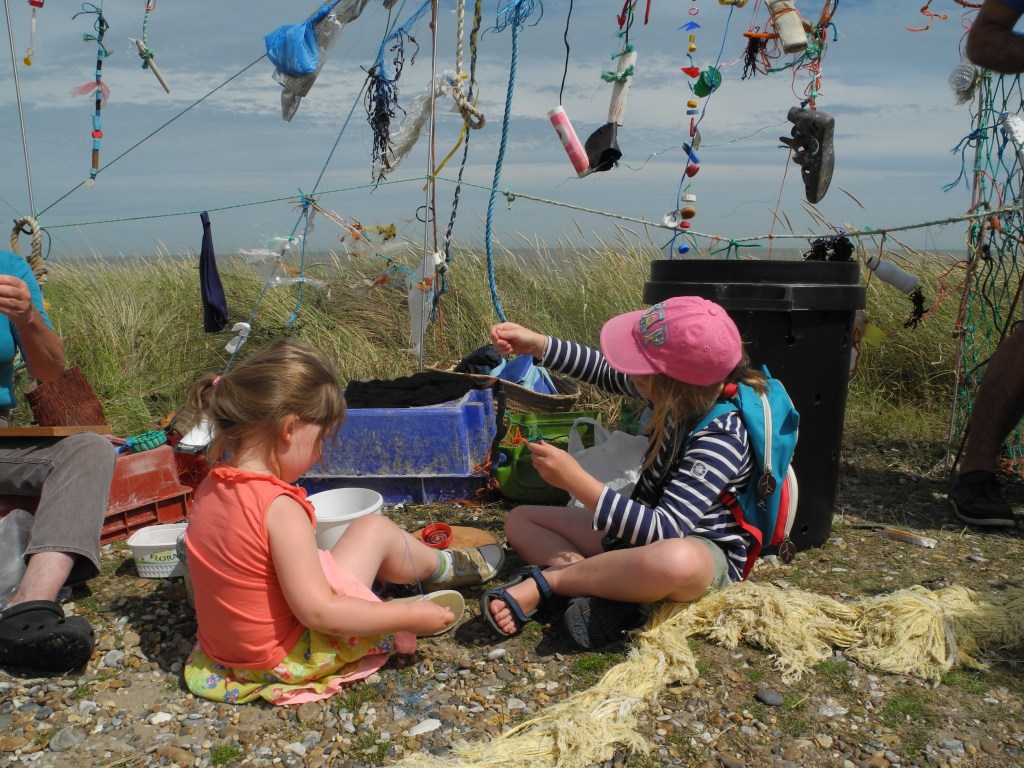 - making a plastic palace on the beach to which visitors brought plastic from the tideline and made entries into a palace journal